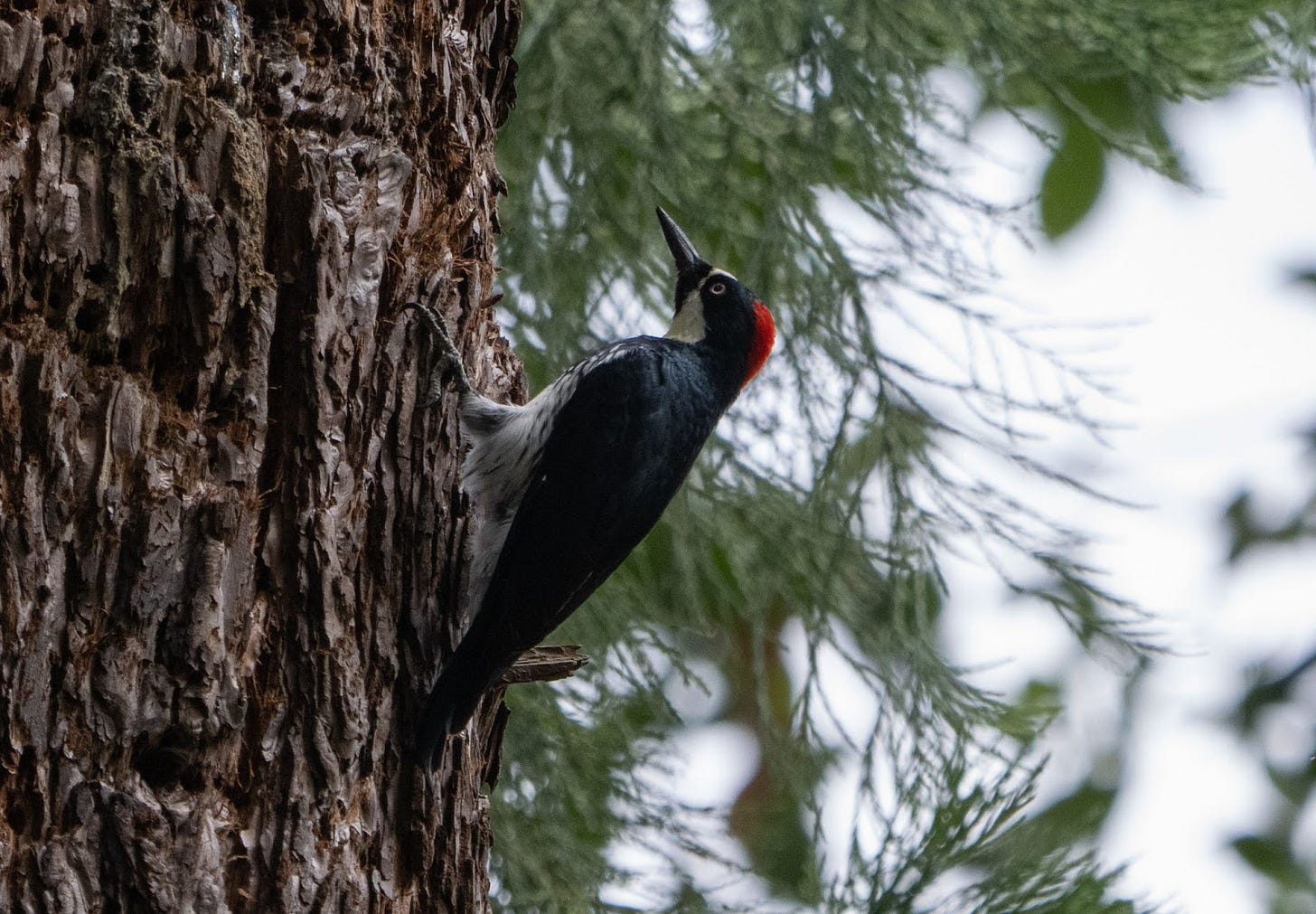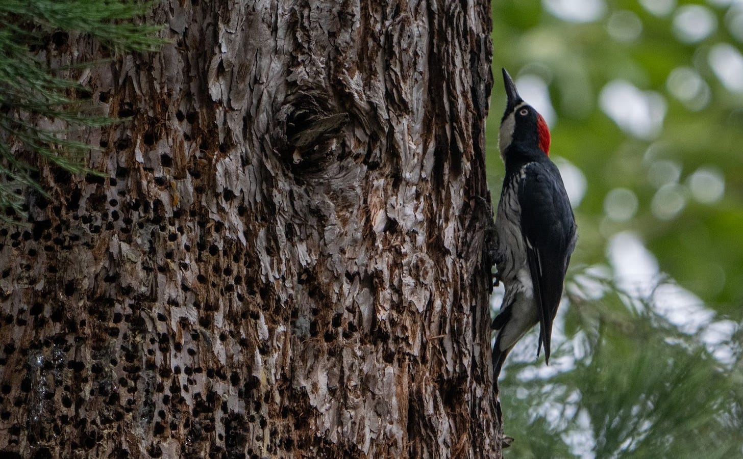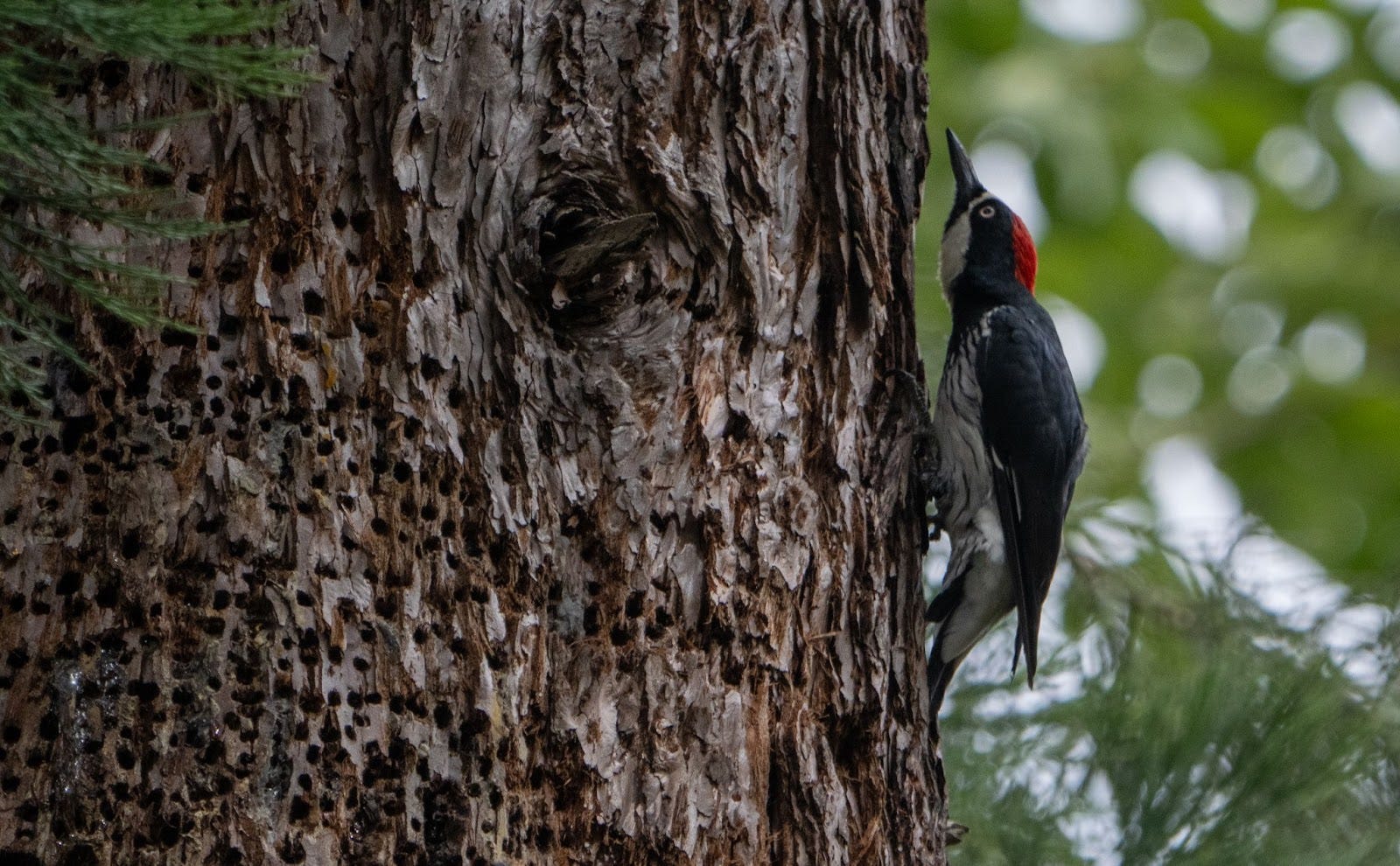 It’s so easy to jump to conclusions. This was not a granary tree, it was simply Acorn Woodpeckers and Sapsuckers interacting around a food source.