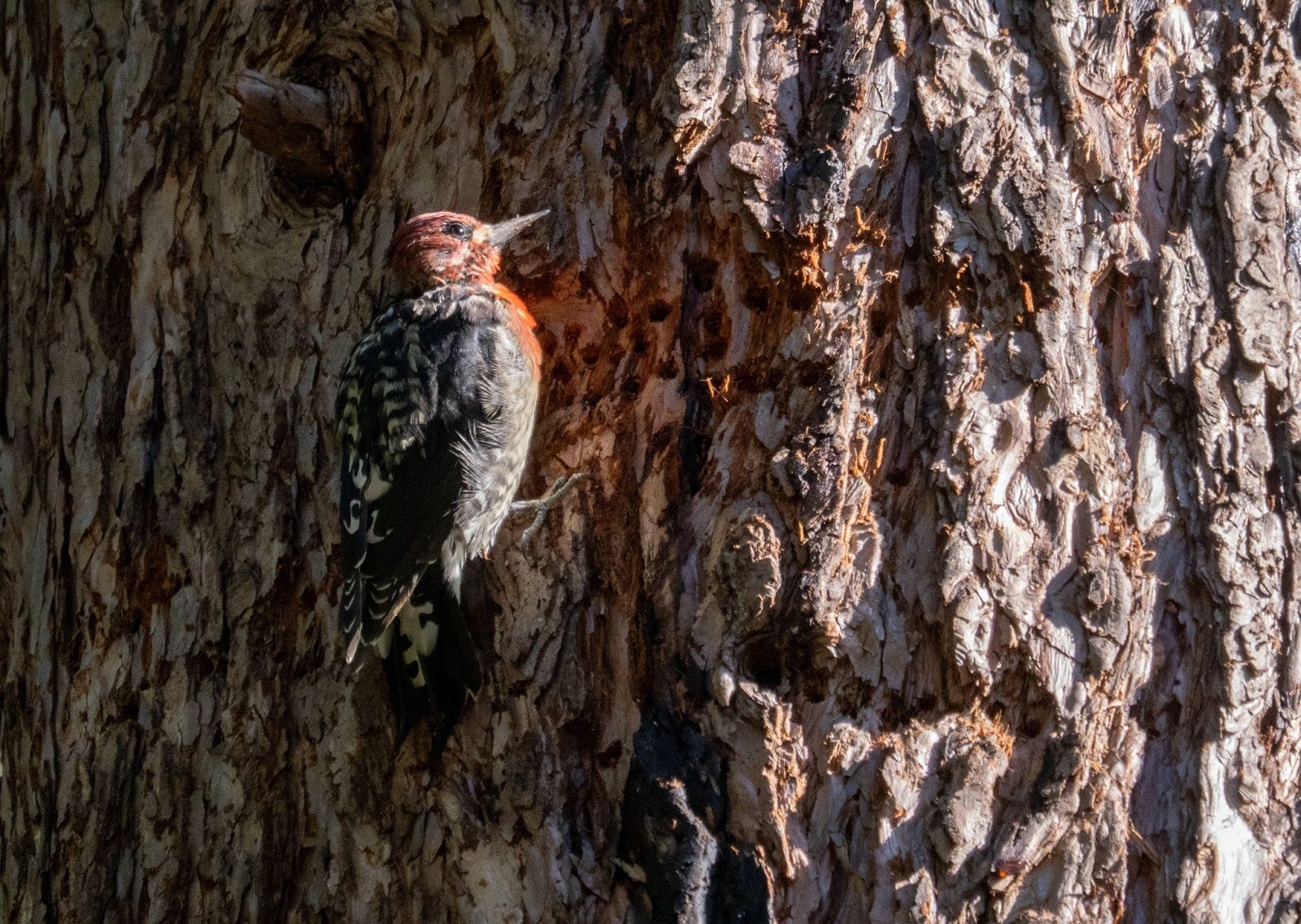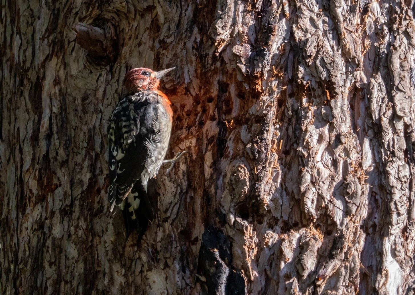 When I finally got a clear look I realized that the 'extras' were some kind of Sapsucker and from the photos I was able to name them, Red-breasted Sapsuckers. The tree was riddled with the neat rows of the small holes that sapsuckers make and reading up on Acorn Woodpeckers I learned they love to take advantage of the work that sapsuckers do.